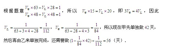 某工程由甲单独做63天,再由乙单独做28天即可完成.如果由甲乙两人合作,需48天完成,现在甲先单独做42天,然后再由乙来单独完成,还需要做____天.