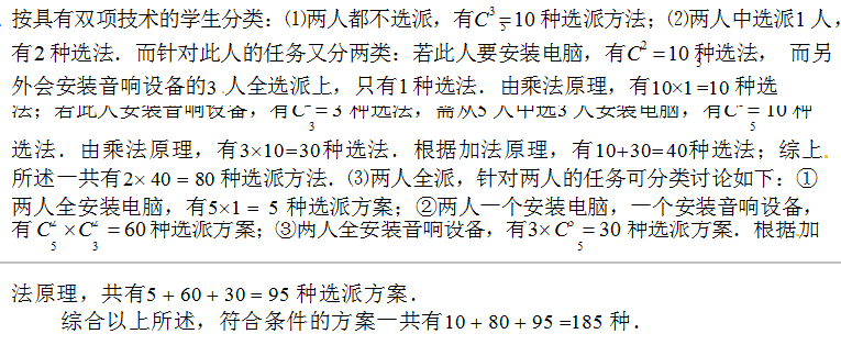 在10 名学生中,有5 人会装电脑,有3 人会安装音响设备,其余2 人既会安装电脑,又会安装音响设备,今选派由6 人组成的安装小组,组内安装电脑要3 人,安装音响设备要3 人,共有多少种不同的选人方案?