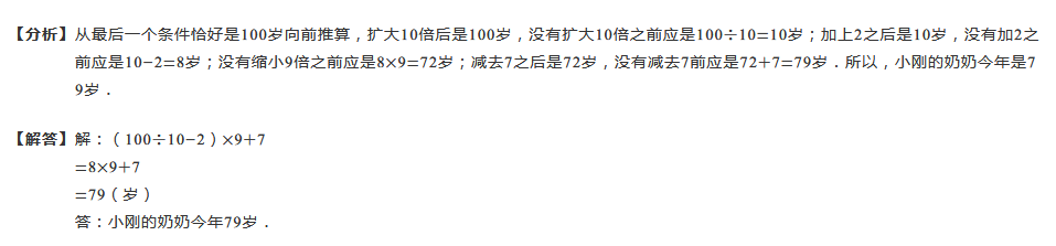 小刚的奶奶今年年龄减去7后,缩小9倍,再加上2后,扩大10倍,恰好是100岁,小刚的奶奶今年多少岁?