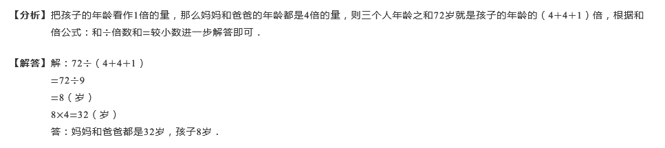 一家有三口人,三个人年龄和是72岁,妈妈和爸爸同岁,妈妈的年龄是孩子的4倍,三人各是多少岁?