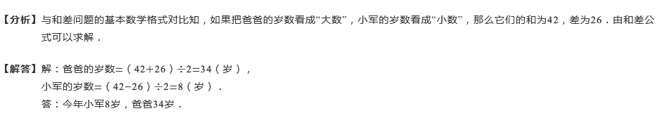 小军和他爸爸今年的年龄和是42岁,年龄差是26岁,小军和爸爸今年各是多少岁?
