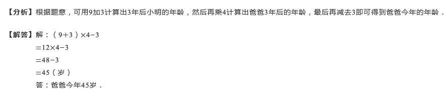 小明今年9岁,再过3年爸爸的年龄是小明的4倍,问爸爸今年多少岁?