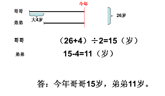 今年兄弟二人年龄和是26岁,三年后哥哥比弟弟大4岁,那么今年哥哥和弟弟各是多少岁?