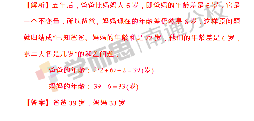 爸爸妈妈现在的年龄和是72岁,五年后,爸爸比妈妈大6岁,今年爸爸妈妈各是多少岁?