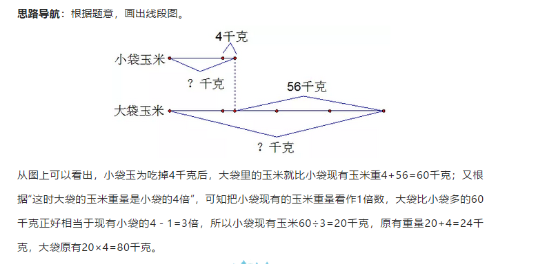 有两袋玉米,大袋比小袋多56千克,如果将小袋的玉米吃掉4千克,这时大袋的玉米重量是小袋的4倍。两袋玉米原来各重量多少千克?