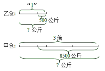 由上图可以看出如果乙仓不运出粮食,甲仓运出8500-500=8000(公斤)粮食,正好相 当于乙仓的2倍,可以通过这种对应关系求出乙仓存面粉的公斤数,再求甲仓存面粉的公斤数。 解:8500-500=8000(公斤) 8000÷2=4000(公斤) 4000×3=12000(公斤) 答:甲仓原有面粉12000公斤,乙仓原有面粉4000公斤。